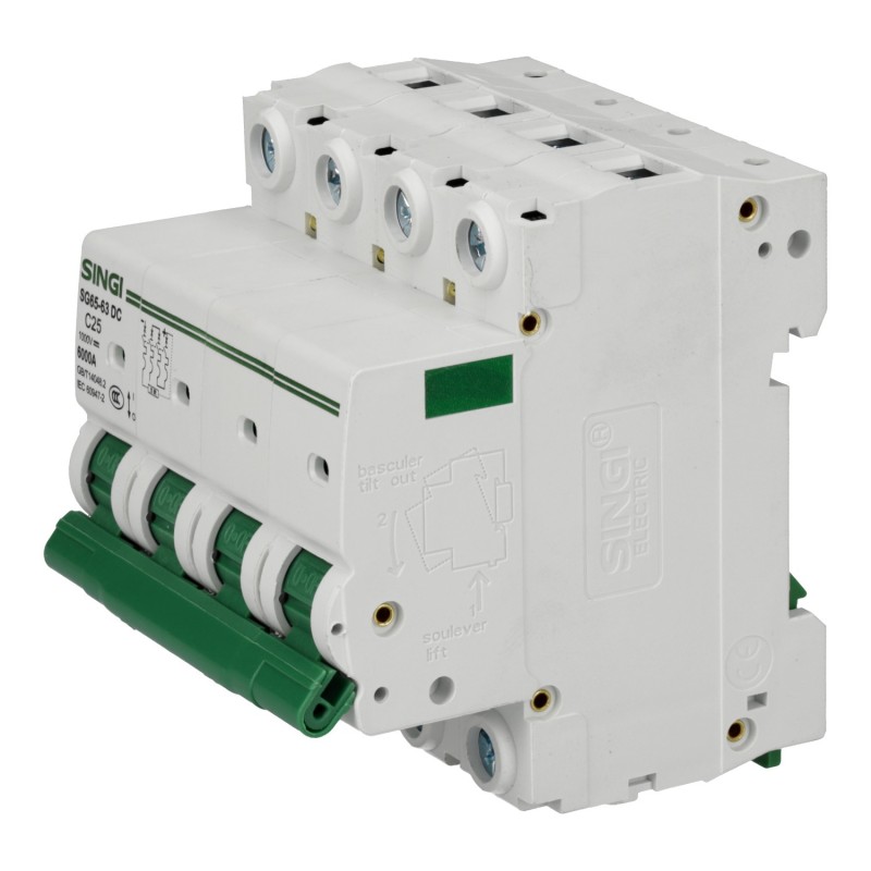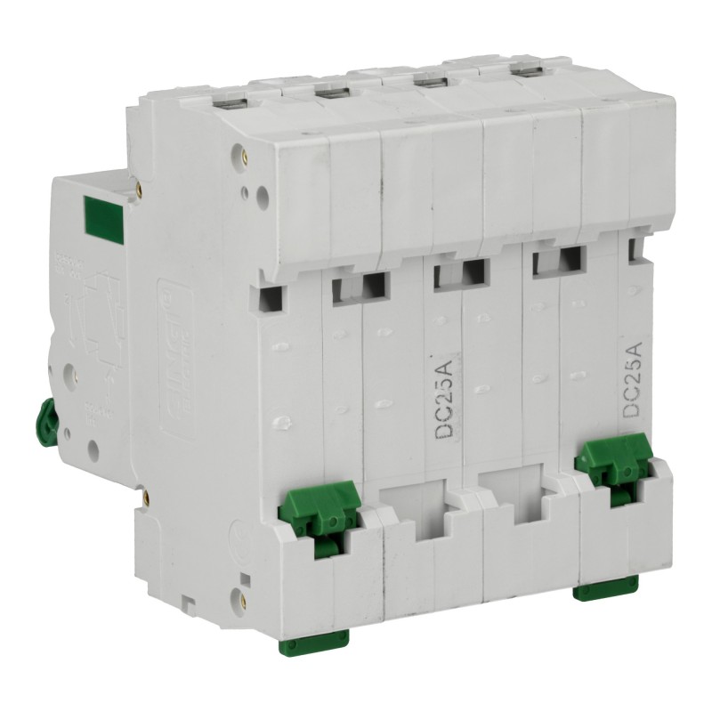 Este interruptor está diseñado para operar en sistemas solares fotovoltaicos con un voltaje máximo de 1000 voltios. Tiene cuatro polos, proporcionando capacidad para desconectar cuatro conductores simultáneamente, y tiene una capacidad de protección contra sobrecargas de hasta 25 amperios. Es una pieza esencial en la protección y seguridad de sistemas solares.