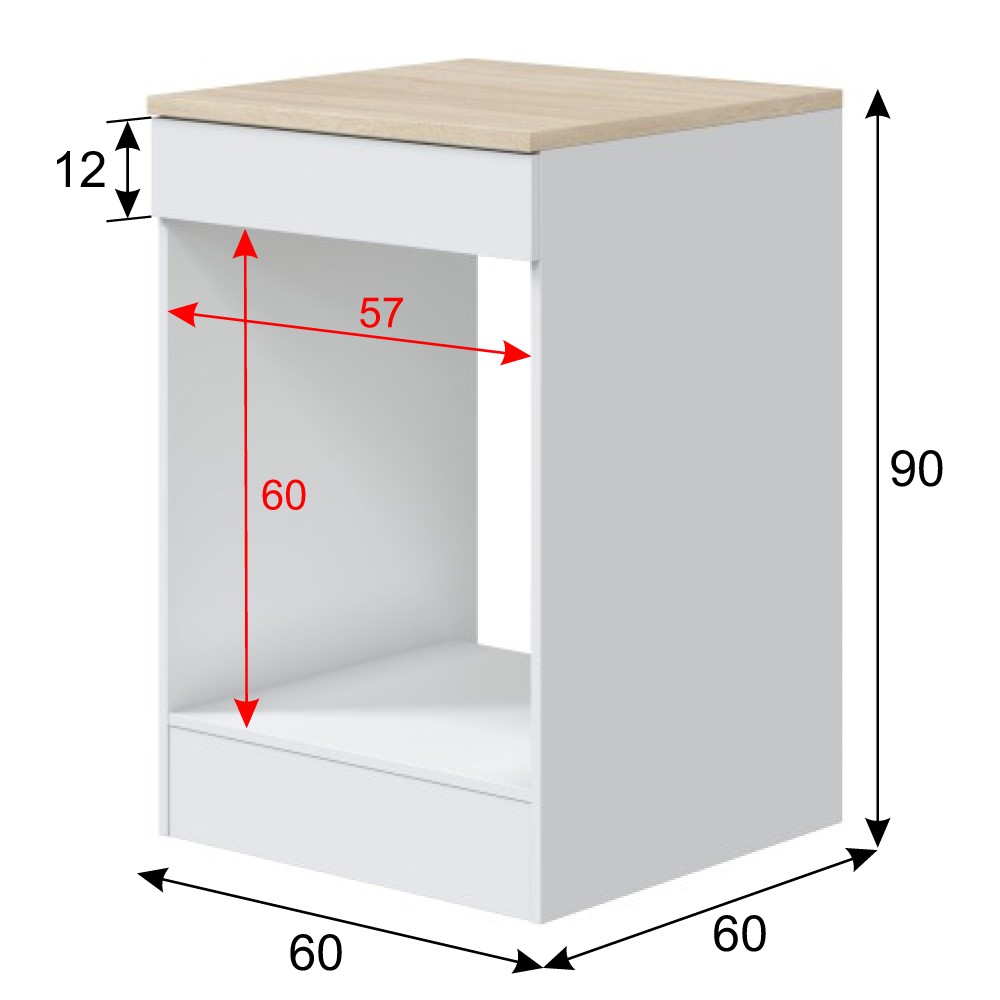 El módulo cuenta con un hueco perfectamente diseñado para alojar un horno estándar de 57 cm de ancho x 60 cm de alto x 60 cm de fondo. Estas dimensiones son compatibles con la mayoría de modelos del mercado, garantizando una instalación armónica y funcional en tu cocina.