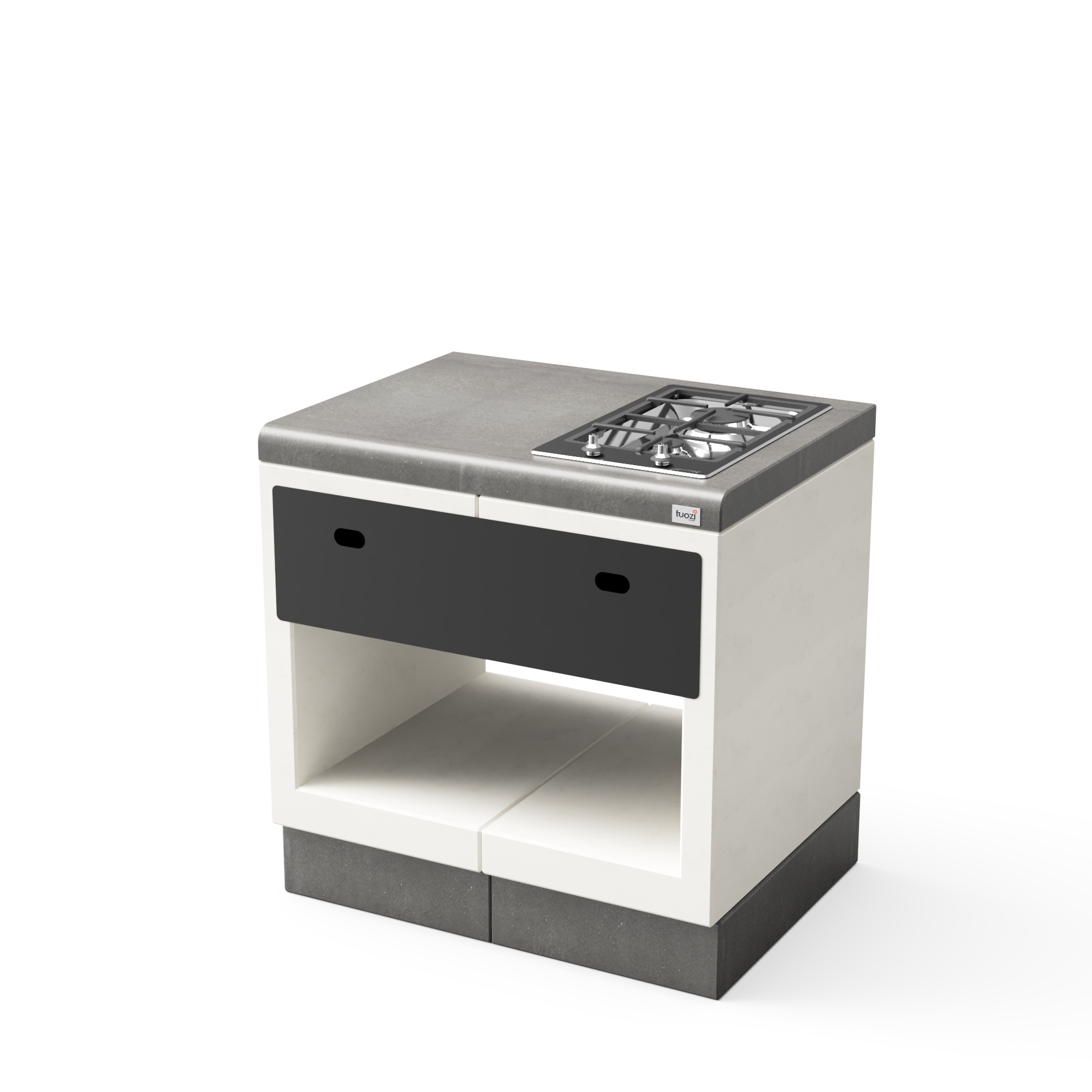 Modulo Kitaway con placa a gas y con cajón blanco y gris, con rodapié