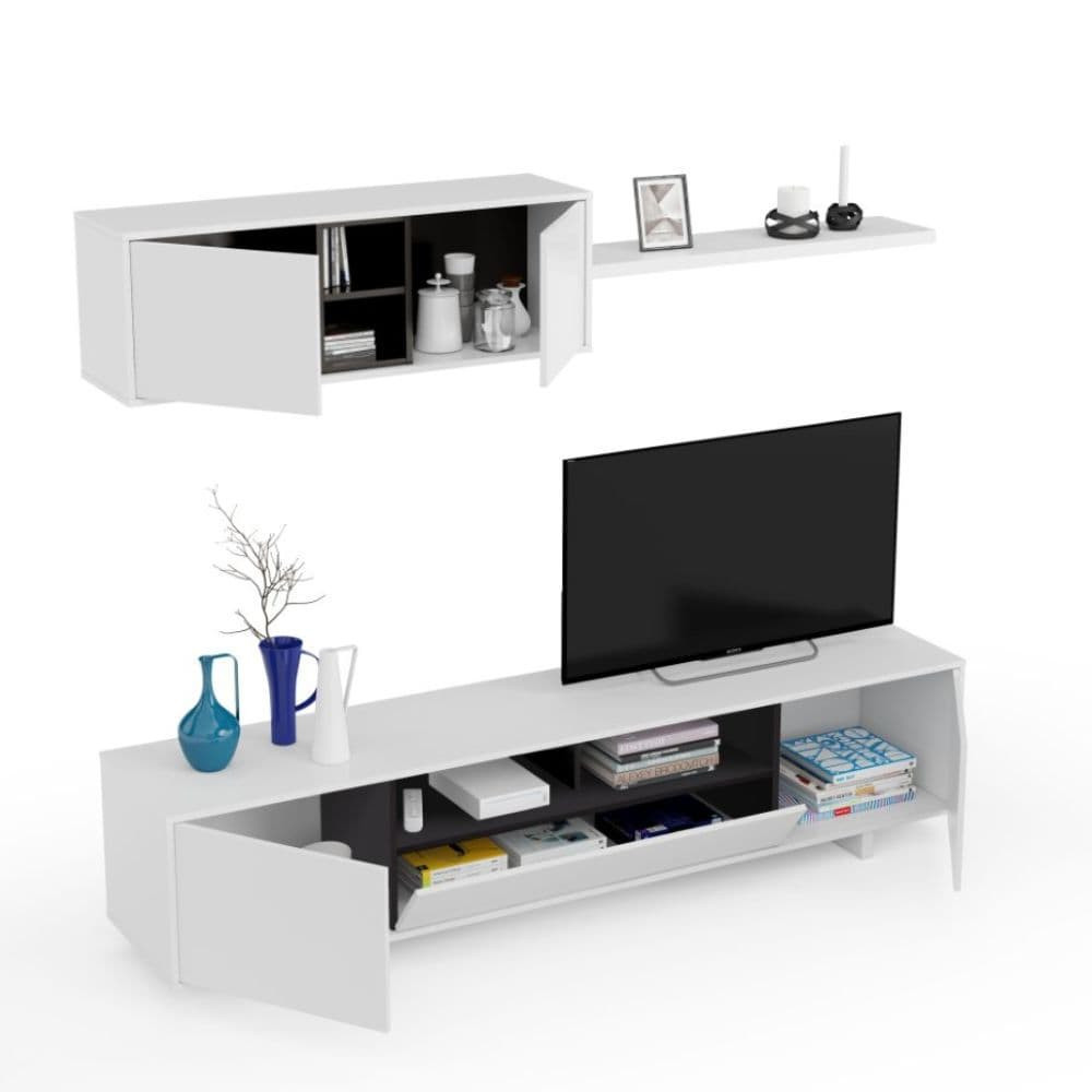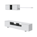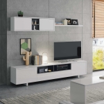 Este conjunto modular no solo ofrece un aspecto contemporáneo, sino que también maximiza el espacio. Con su módulo de televisión con puertas batientes y abatible, módulo superior colgante y estante a juego, puedes organizar tus pertenencias sin perder la estética. El blanco brillo refleja la luz, creando un ambiente luminoso y amplio, mientras que el gris antracita añade un toque de elegancia.