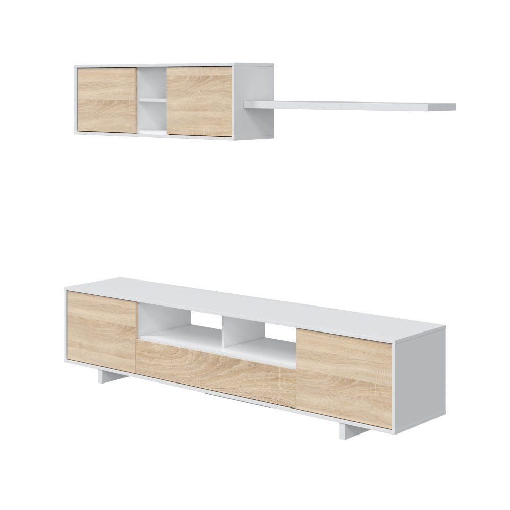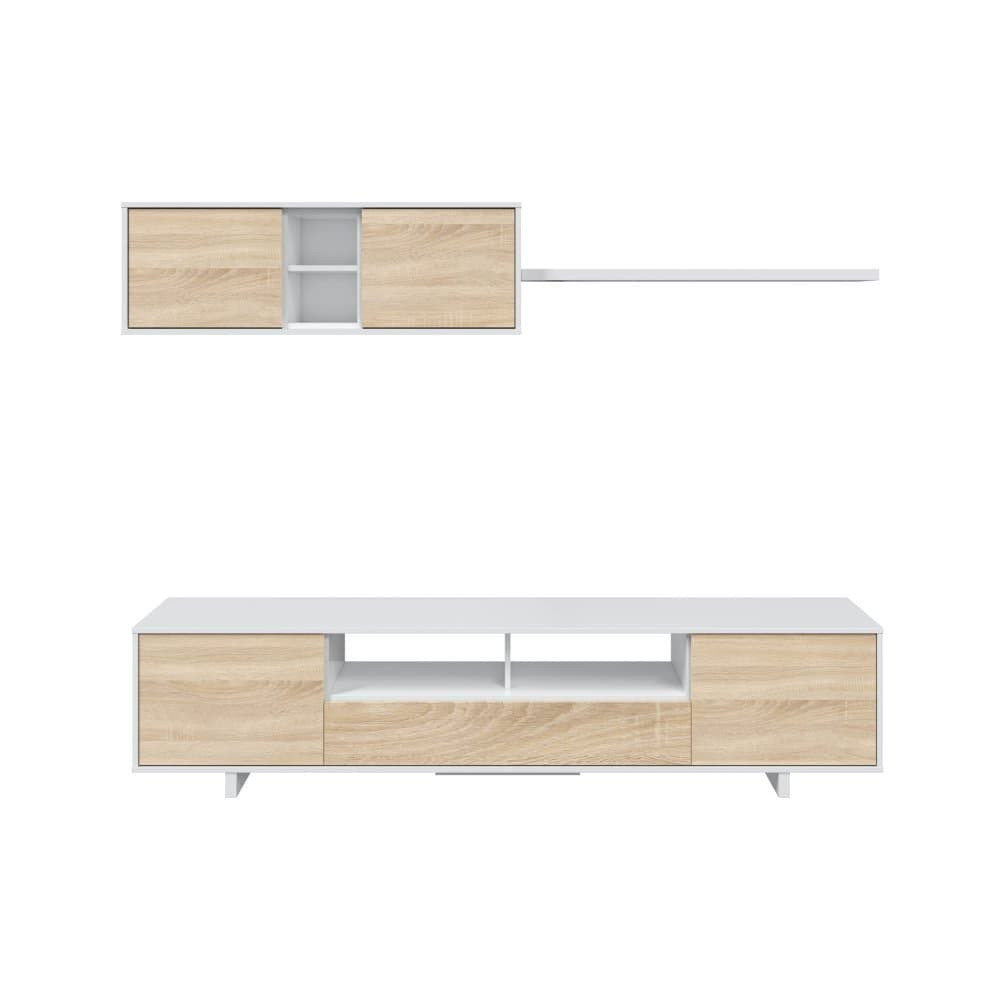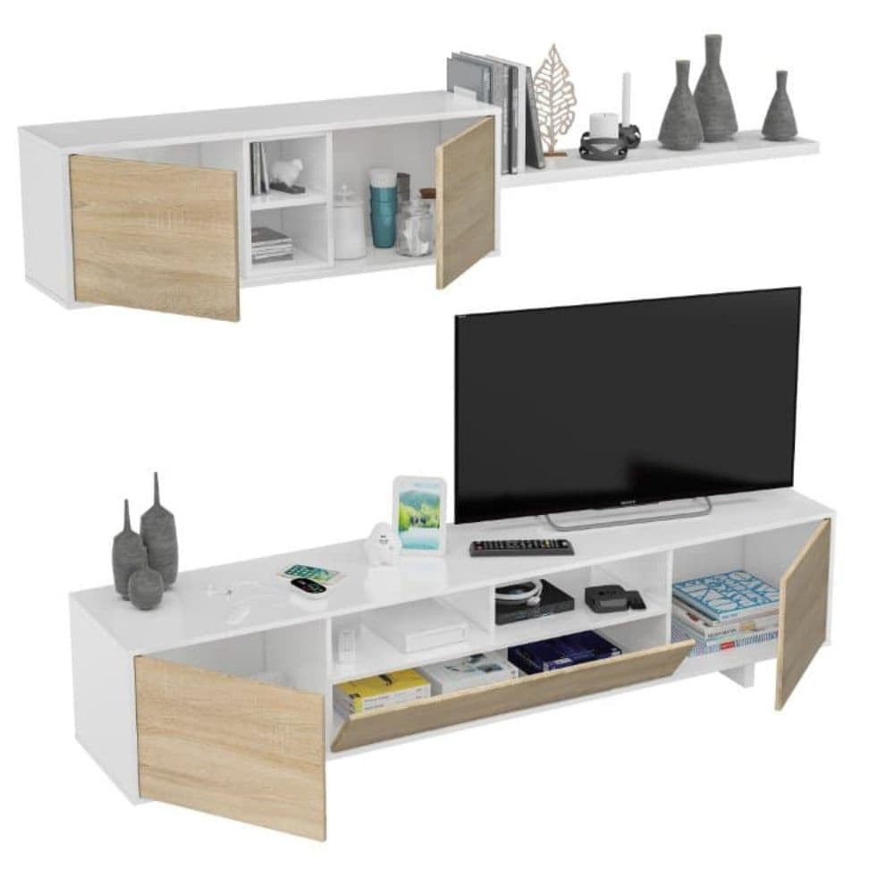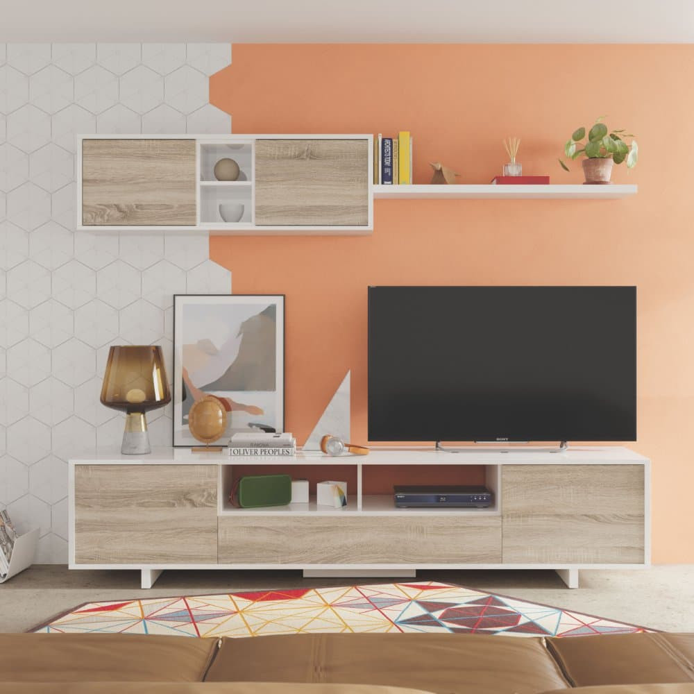 Está compuesto por un módulo bajo para televisión, un módulo colgante superior y un estante decorativo. El módulo inferior cuenta con tres puertas (dos batientes laterales y una central abatible hacia abajo), ideal para ocultar cables, aparatos electrónicos o accesorios del día a día. Además, dispone de huecos abiertos en el centro con orificios pasacables que permiten mantener los equipos conectados y bien ordenados sin perder estética.