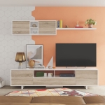 Formado por módulo de televisión, módulo superior colgante y estante decorativo, este conjunto destaca por su funcionalidad y equilibrio estético. Su acabado en blanco brillo potencia la luz de la estancia, mientras que el tono roble canadian aporta ese aire nórdico tan de tendencia que nunca pasa de moda.