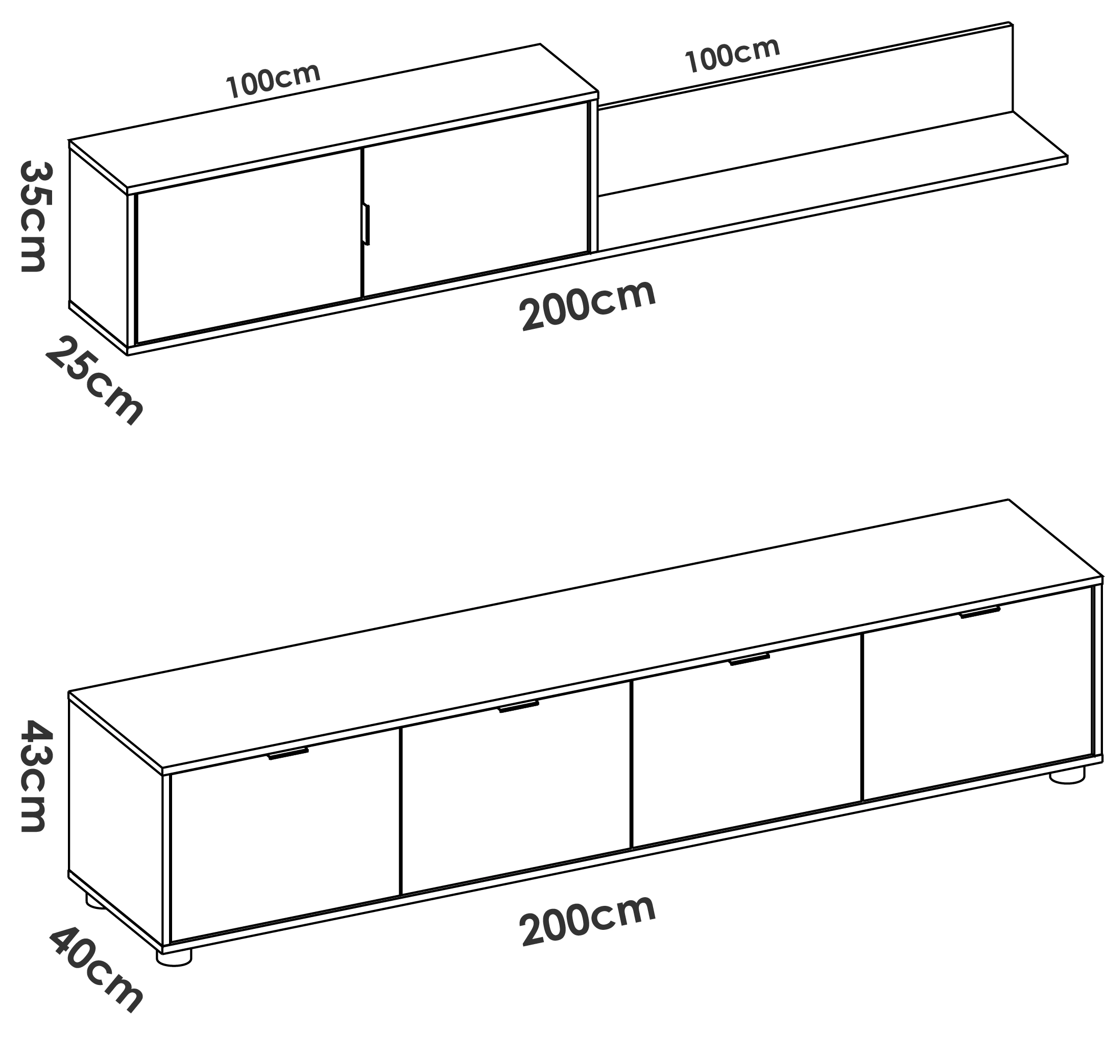 - Altura: 43 cm (mueble bajo) / 35 cm (módulo superior)