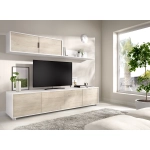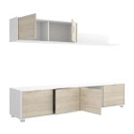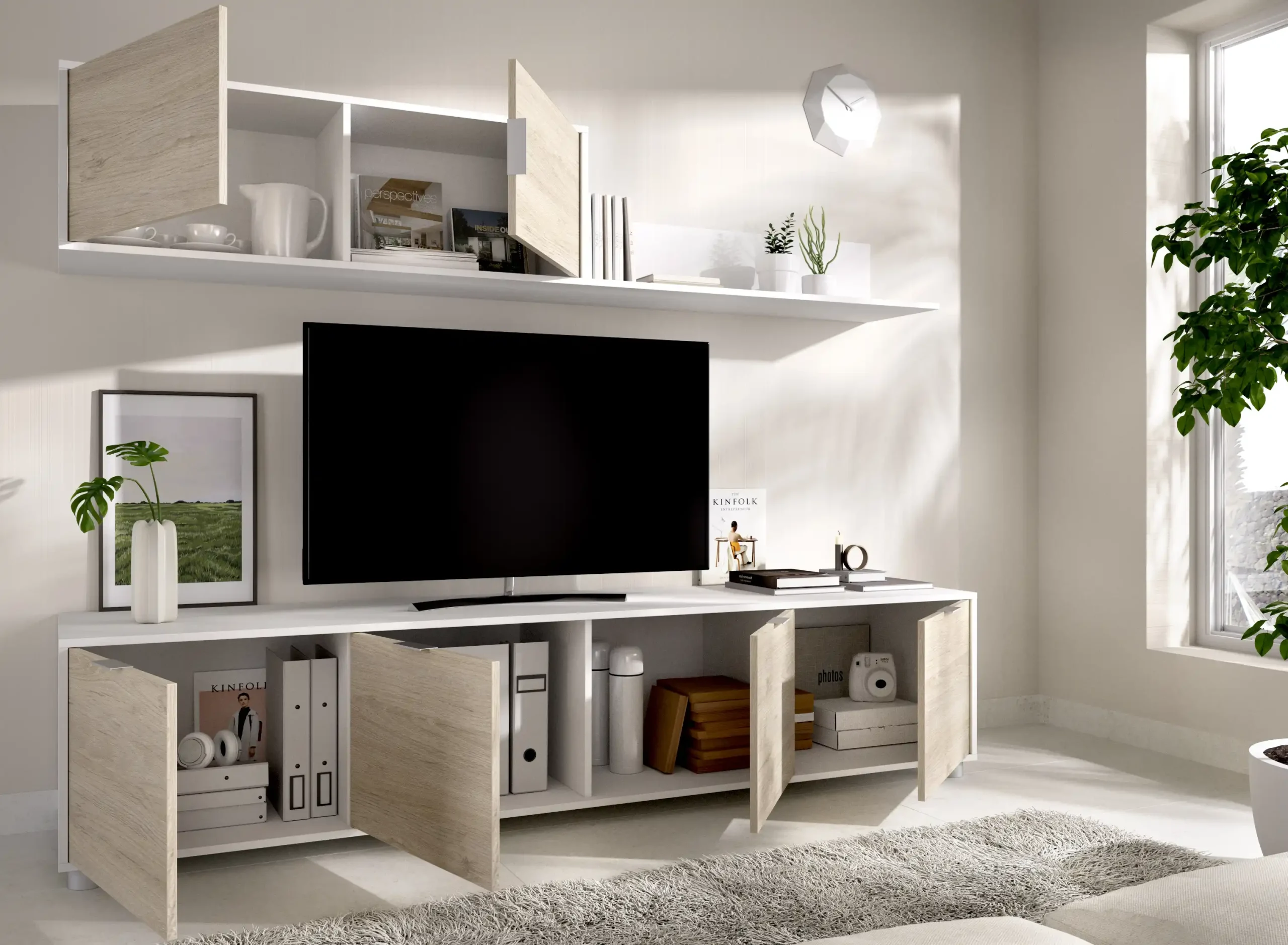 - Módulo superior: Incluye un módulo horizontal con 2 puertas batientes y un estante mural integrado. Ideal para exhibir tus objetos decorativos favoritos, libros o plantas, añadiendo un toque personal a tu salón.