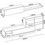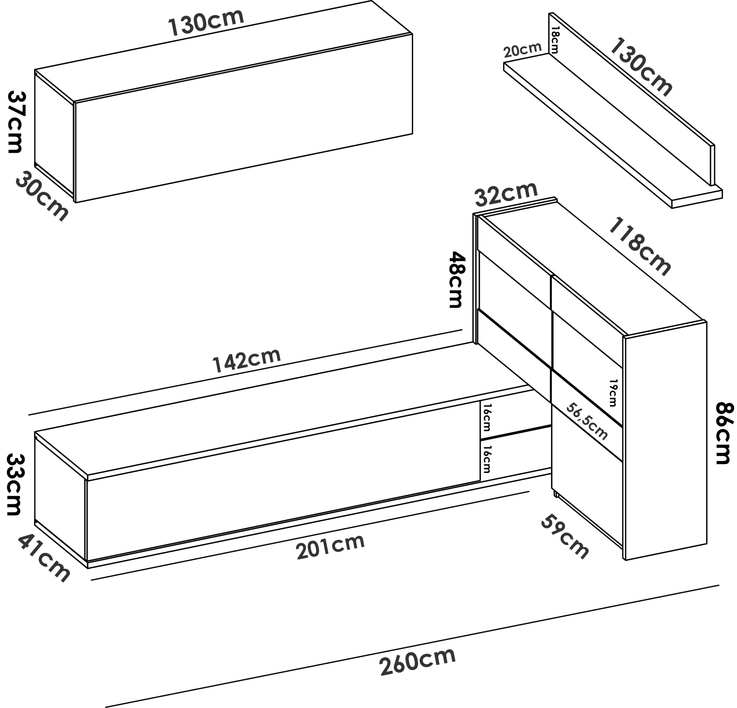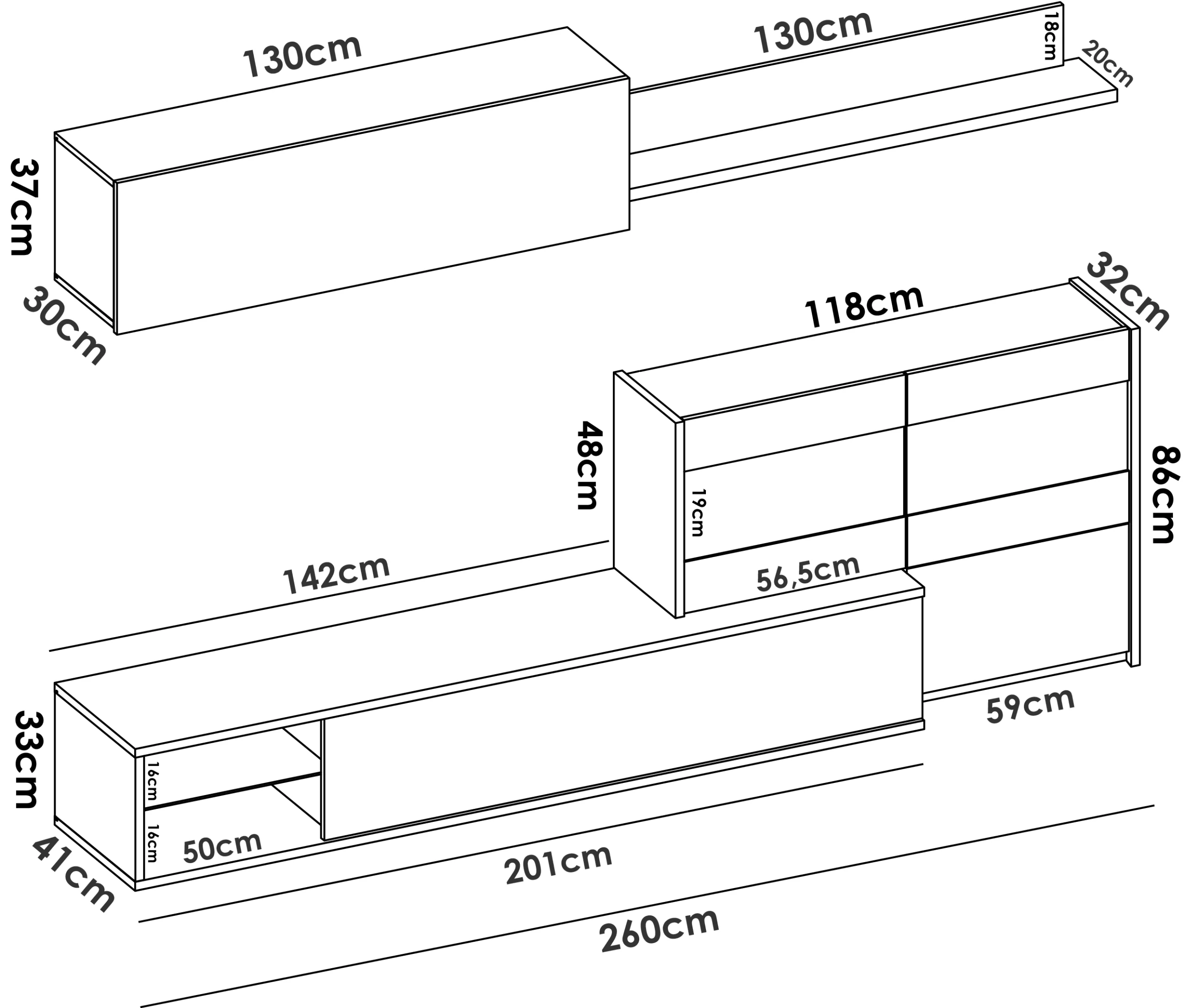 - Mueble TV: 86 cm (alto) x 260 cm (ancho) x 41 cm (profundidad)