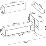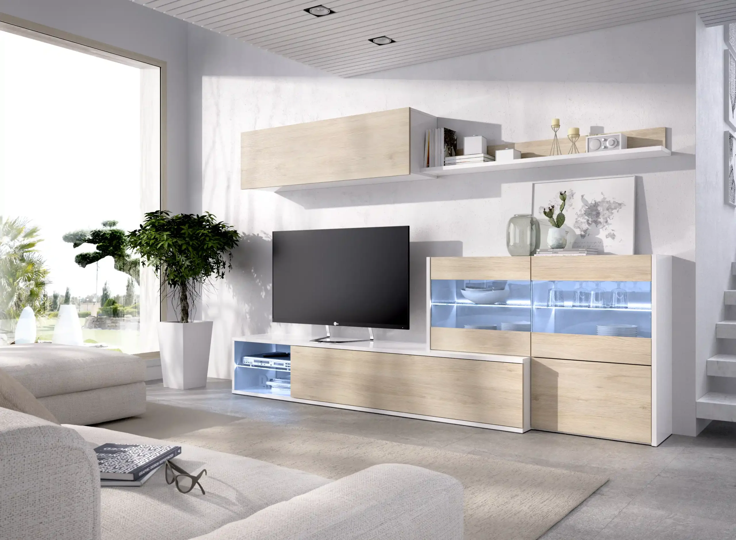 - Módulo superior aéreo: Con estante decorativo y varios armarios para guardar todo lo que necesites, manteniendo tu salón ordenado.