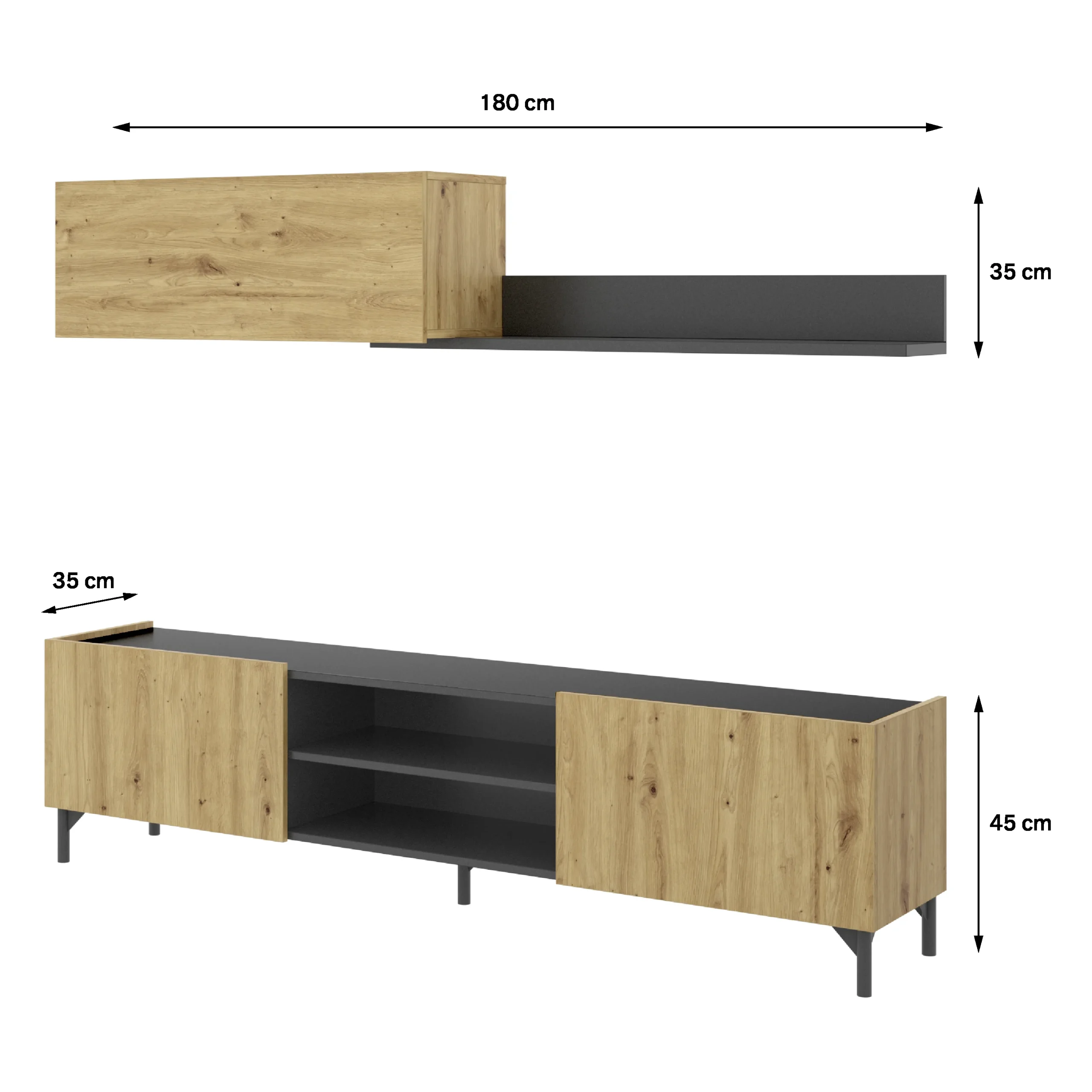 ¡Dale un aire nuevo a tu salón con la composición de TV TASS! Este conjunto es la fusión perfecta entre el estilo industrial y las líneas rectas, combinando el elegante grafito con la calidez del nordic. TASS te ofrece no solo un mueble, sino una declaración de diseño para tu hogar.