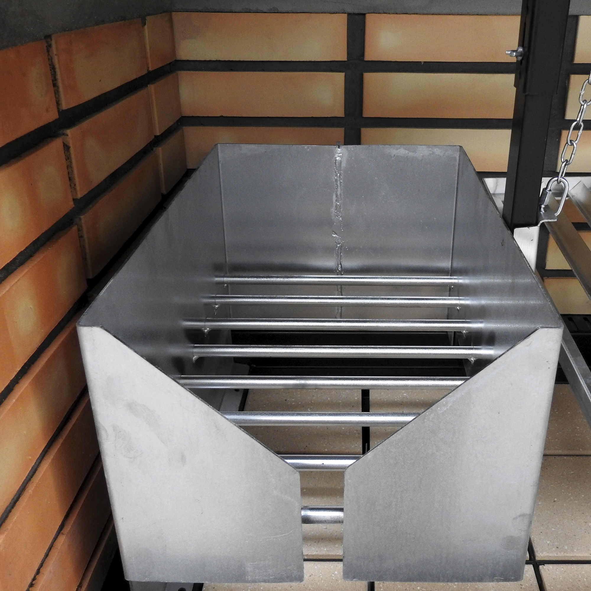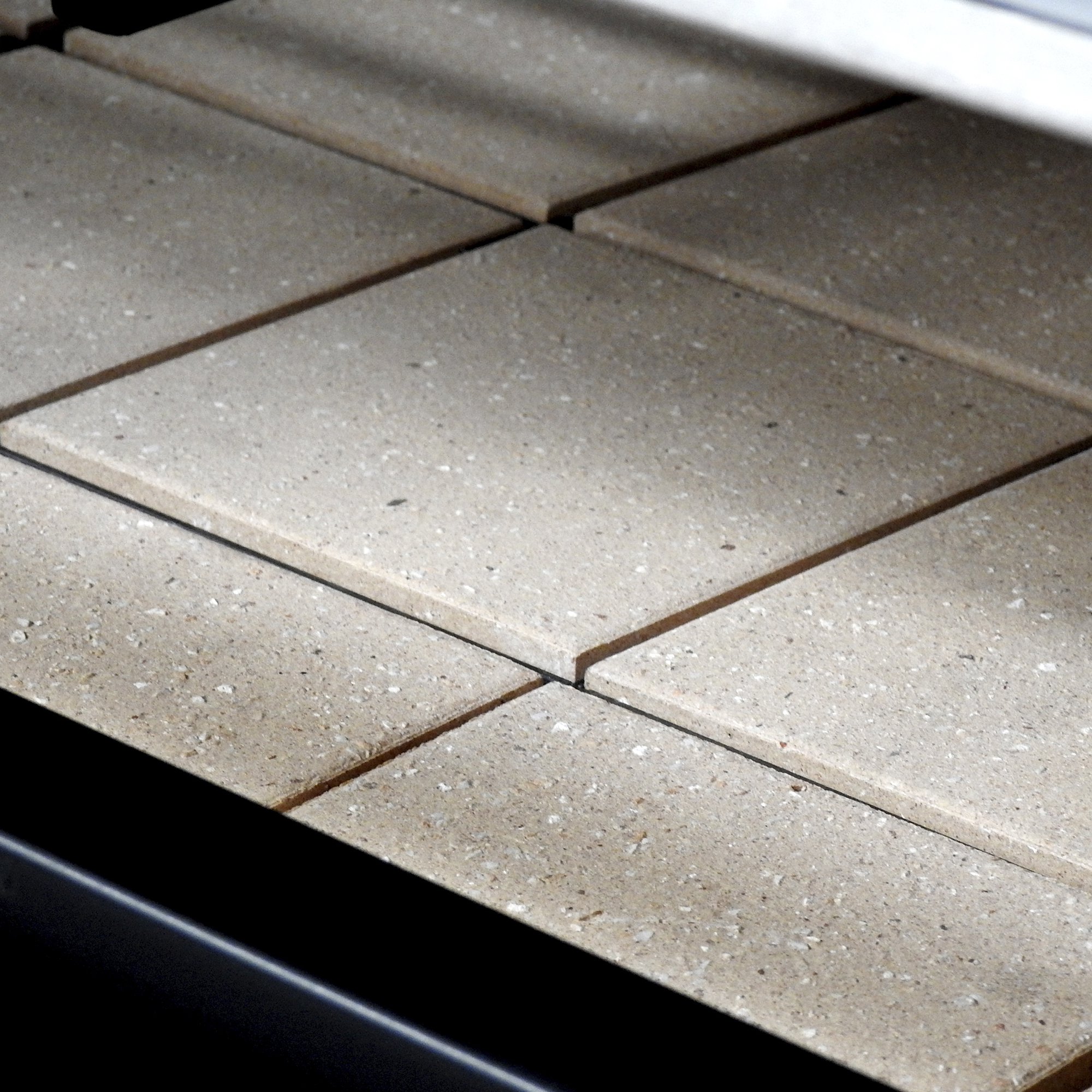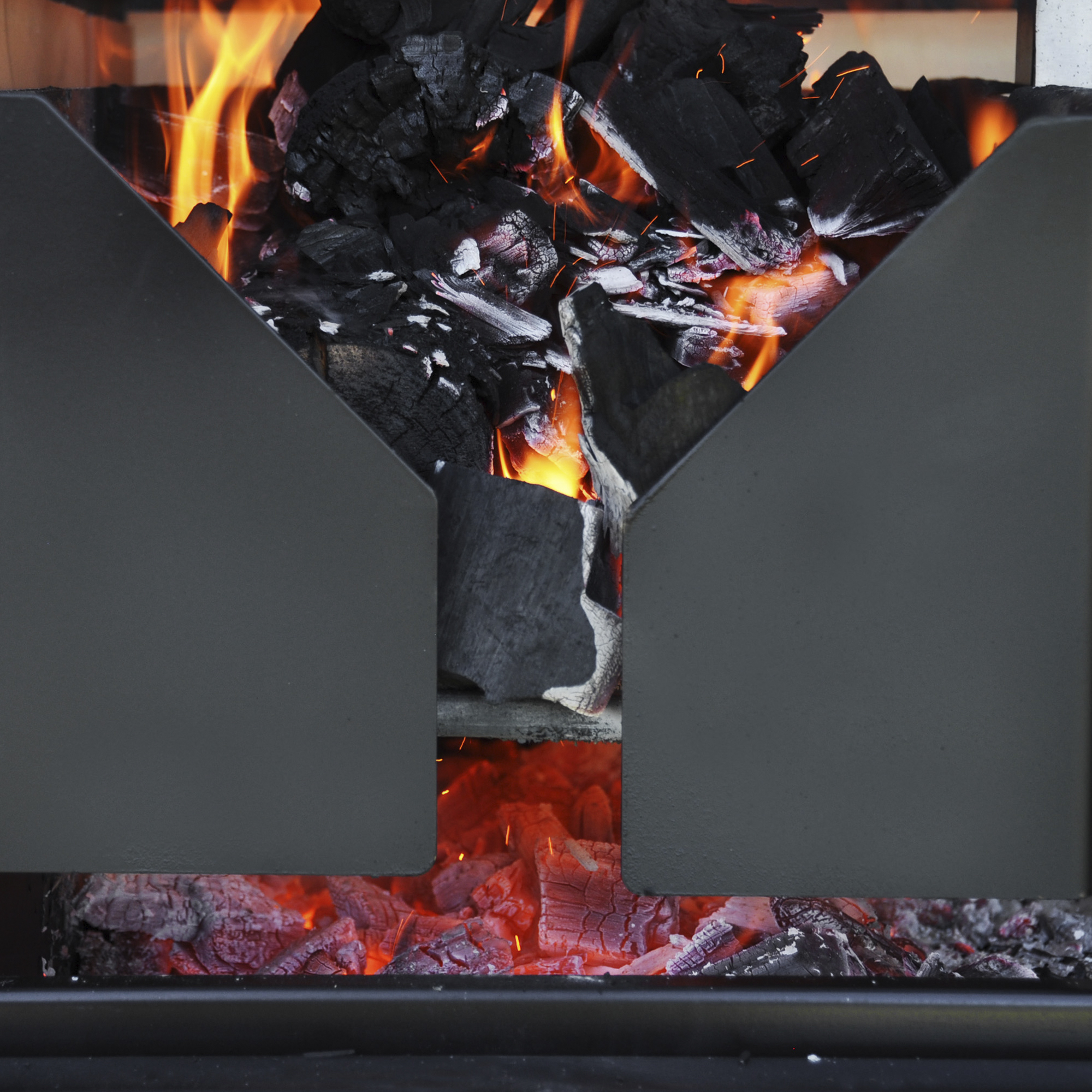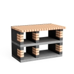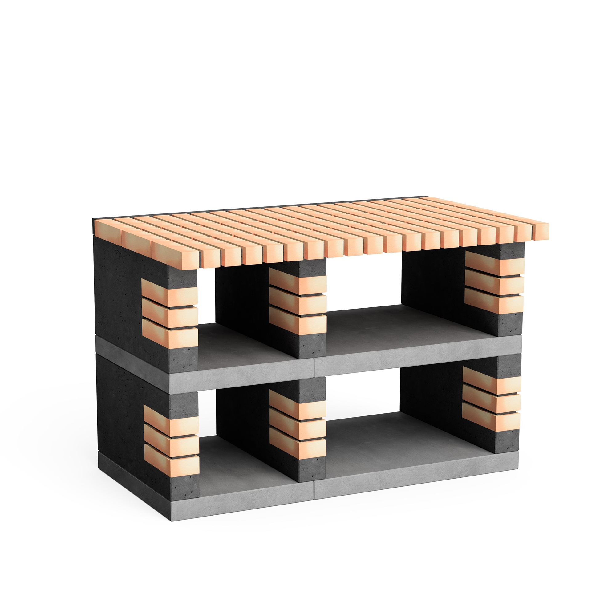 Un módulo con soporte lateral de ladrillo naranja y hormigón refractario. Cuenta con un estante superior de ladrillo de 120 x 70 cm y dos estantes de hormigón. Su base de hormigón garantiza una instalación nivelada y no requiere pintura.