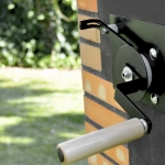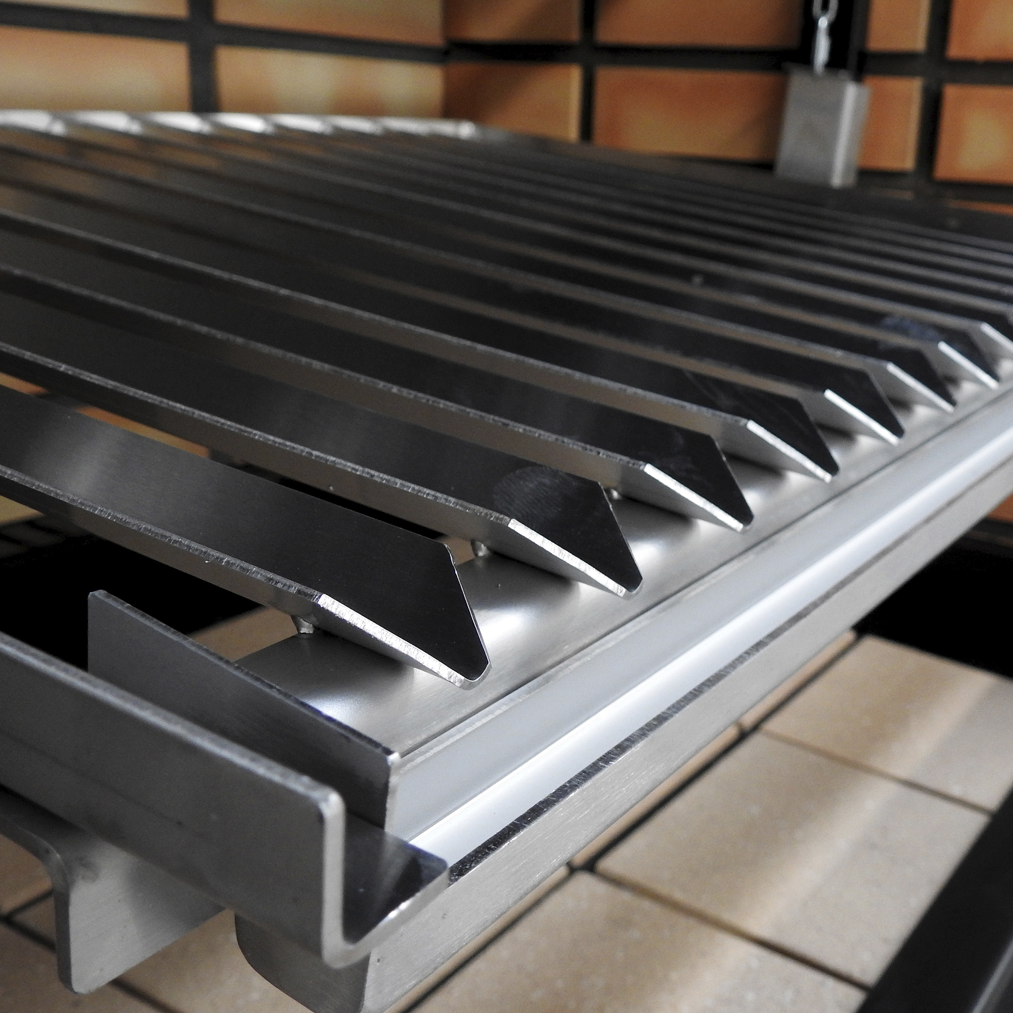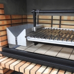 Una barbacoa de ladrillo naranja y hormigón refractario con inserto metálico y campana. Incluye una parrilla argentina de acero inoxidable 304 (65x50cm) con bandeja de grasa, un brasero lateral para leña y un cajón metálico para la limpieza de cenizas. La parrilla se eleva mediante un sistema de manivela y cuenta con una campana metálica. Además, tiene dos estantes de hormigón y una base de hormigón para una instalación nivelada. No requiere pintura y es ideal para grupos de hasta 15 personas.
