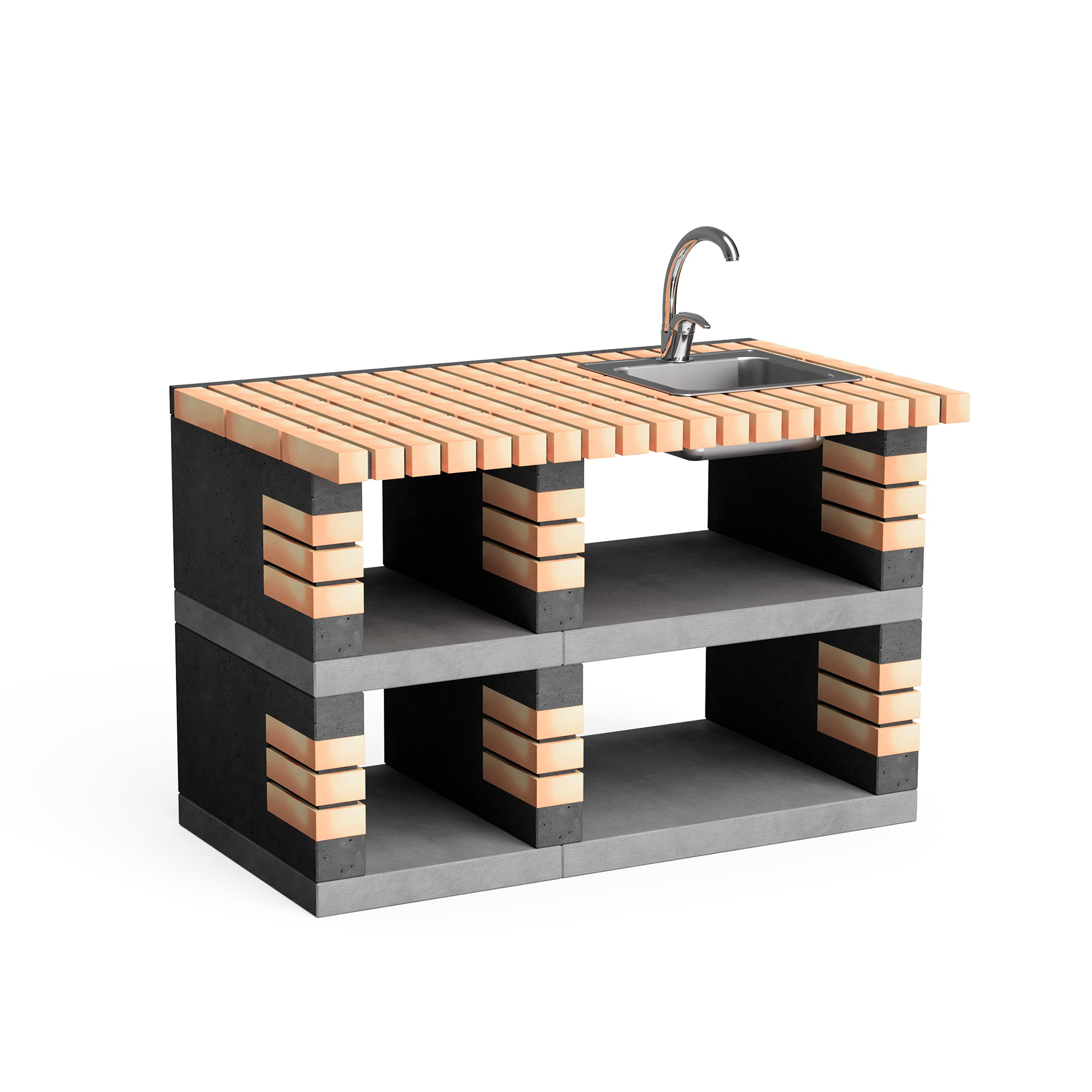 Un módulo con soporte lateral de ladrillo naranja y hormigón refractario que incluye un fregadero con grifo integrado. Posee un estante superior de ladrillo de 120 x 70 cm, dos estantes de hormigón y una base de hormigón para una instalación nivelada. No requiere pintura.