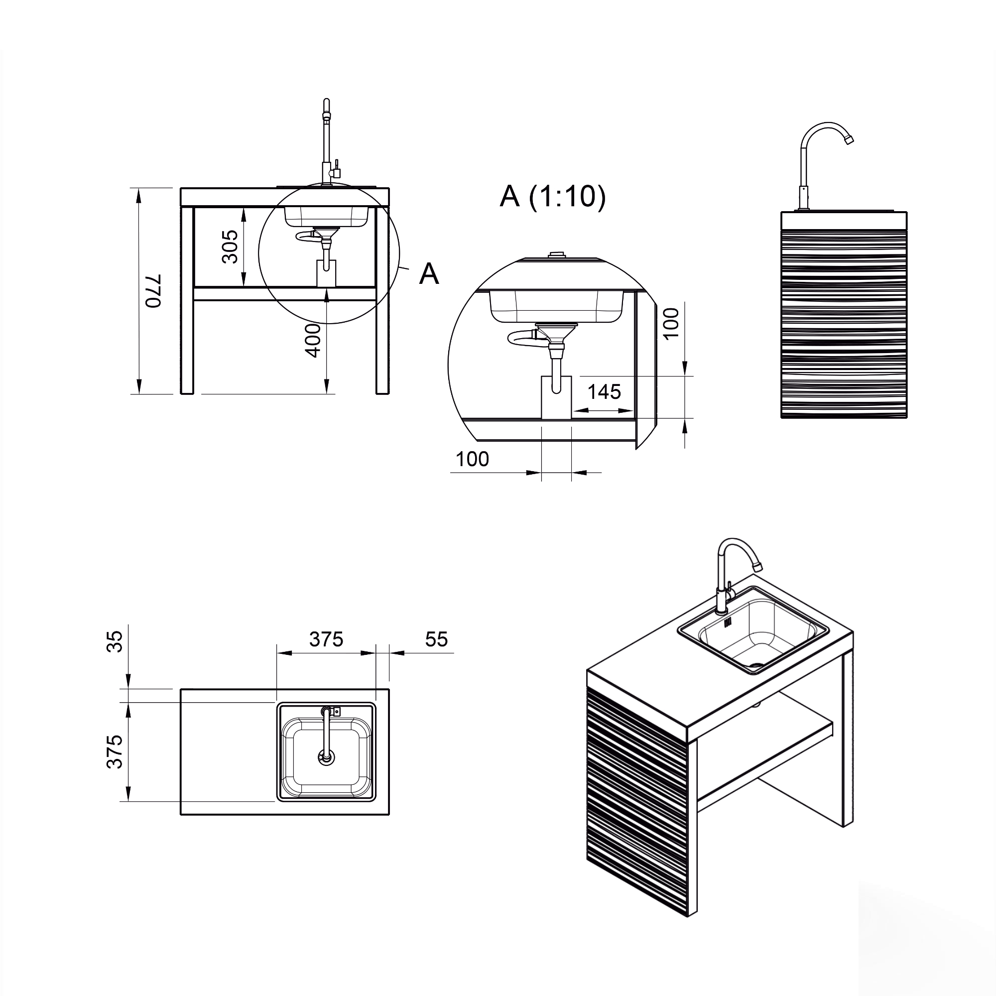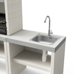 Disfruta de la comodidad del fregadero integrado PLAN/VENIT 1 SINK/TAP, fabricado en concreto blanco y gris con detalles texturizados. Su estante inferior de hormigón liso blanco, el lavabo de acero inoxidable y el grifo cromado te permitirán preparar y limpiar tus alimentos con facilidad. Este pack es compatible con las series de barbacoas PLAN y VENIT, brindándote versatilidad para personalizar tu espacio exterior.