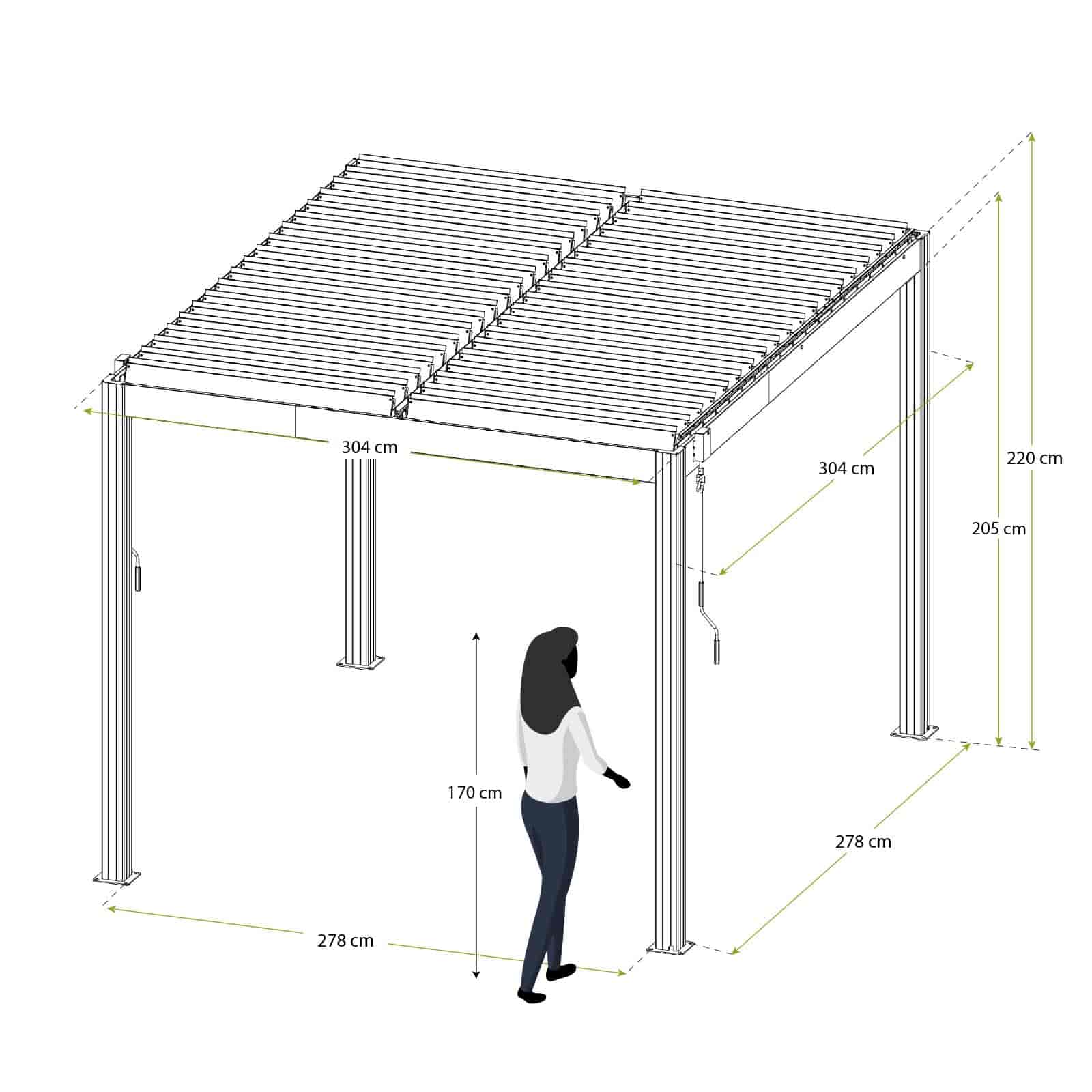 Sus lamas de acero galvanizado en color antracita se ajustan de 0 a 100 grados, permitiendo controlar la cantidad de luz solar que entra. La división central te da la libertad de ajustar cada lado independientemente, adaptándose a las necesidades del sol o la ventilación. Una manivela integrada facilita el ajuste de las lamas, mientras que el sistema de drenaje para aguas pluviales asegura un funcionamiento óptimo.