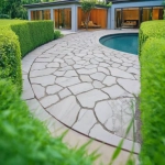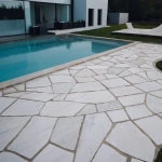 - Pavimento alrededor de la piscina: Esta piedra es ideal para pavimentar zonas exteriores, incluyendo bordes de piscina y escaleras, proporcionando seguridad y un acabado estético gracias a sus cantos redondeados.