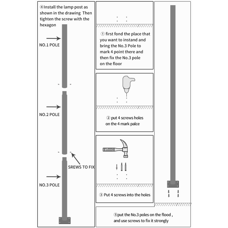 Vea en las imágenes las cotas de la base para la instalación de esta. Por favor recuerde anclar el poste para farola sobre una superficie firme u dura para evitar posibles daños o accidentes.