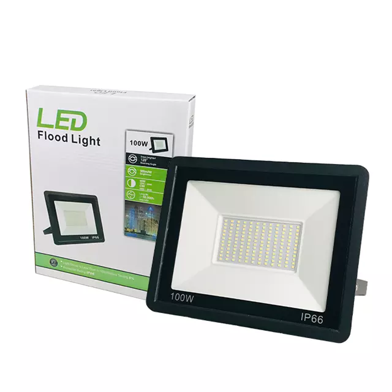 Foco proyector led Slim de color negro, 100W de potencia, luz blanco frío 6000K.