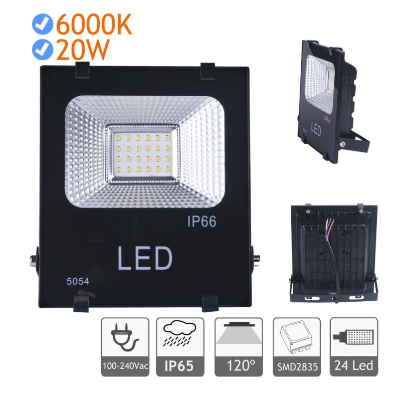 Foco proyector led de color negro 20W de potencia color de la luz blanco frío 6000K.