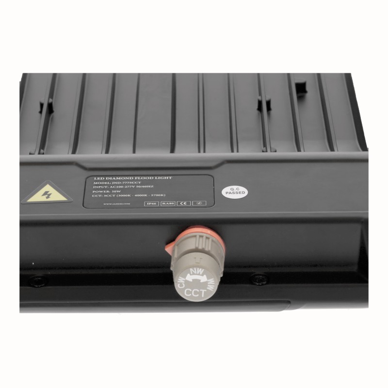 Este proyector tiene un consumo de 50W, con un rendimiento lumínico sobresaliente de 150 lm/w, logrando una emisión aproximada de 7.500 lúmenes; lo que maximiza el ahorra en el consumo eléctrico. También incluye un selector CCT para elegir entre 3 temperaturas de color: 3000K (ambientes acogedores y decorativos), 4000K (ideal para espacios de trabajo) y 5700K (para zonas que requieren alta visibilidad y claridad). Esta funcionalidad nos permite adaptar el proyector a las necesidades específicas del entorno y de la actividad.
