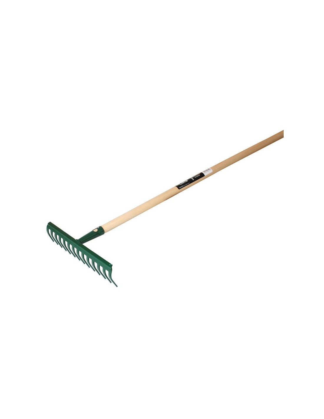 El rastrillo está fabricado con materiales de alta calidad. La base metálica es robusta y resistente al uso continuo, mientras que el mango de madera barnizada garantiza un agarre seguro y una larga vida útil del producto.