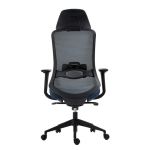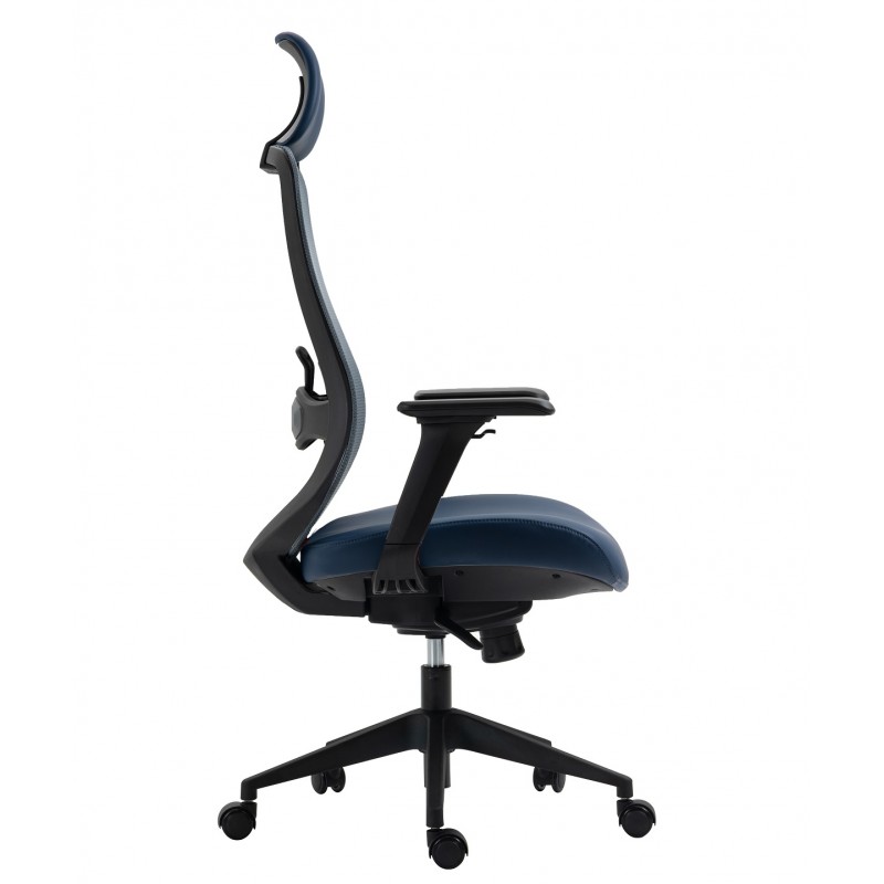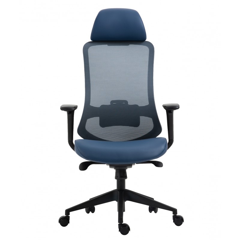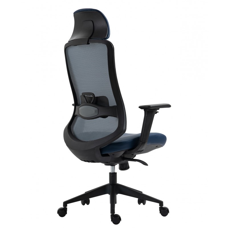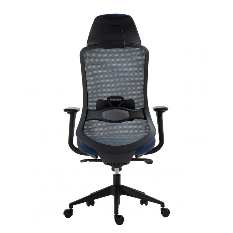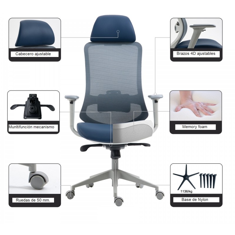 El respaldo se tapiza en malla translúcida azul, lo que ayuda a mejorar la ventilación y reduce la presión en la columna. El asiento es tapizado en similpiel azul y cuenta con espuma moldeada con memory foam para mayor comodidad.