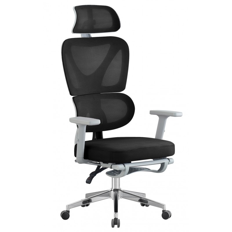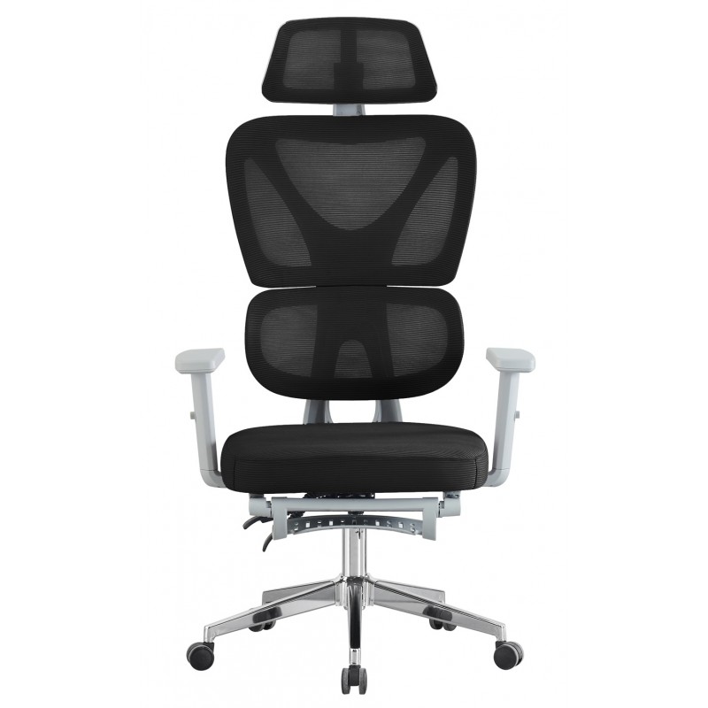 El sillón cuenta con un reposapiés plegable en la parte inferior del asiento para mayor comodidad, y ambos respaldos -del asiento y del cabecero- están tapizados con malla translúcida de color negro. El asiento, por su lado, está tapizado en tejido negro.