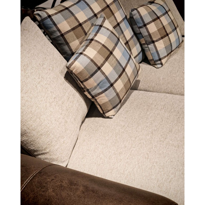 Las patas de madera maciza completan su estética natural y robusta. La combinación de 3 cojines decorativos grandes y dos pequeños añaden una nota de personalidad única a tu sala de estar. Los tachuelas decorativas son un detalle que agrega un toque de elegancia.