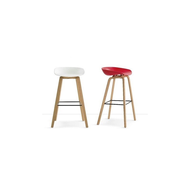 Transforma tu espacio de trabajo o comedor en un oasis de estilo con nuestro Taburete AWAK, una pieza de diseño que combina la elegancia de la madera con el brillo del polipropileno rojo.