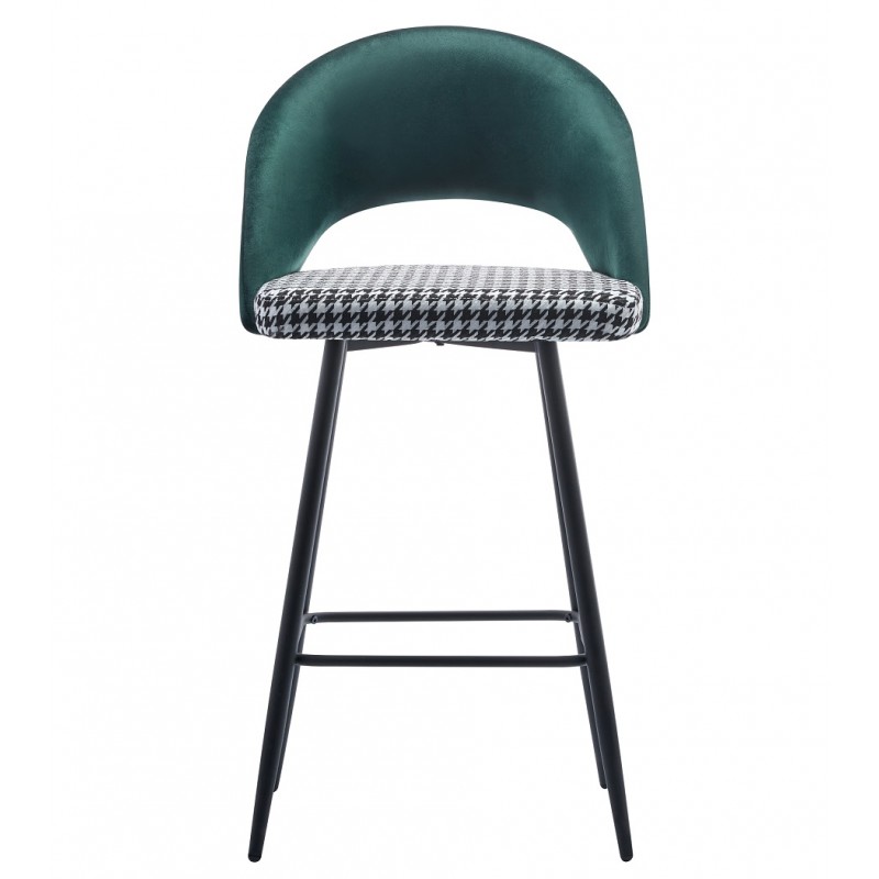 Respaldo de Textil: El respaldo está tapizado en tejido velvet verde oscuro, proporcionando comodidad y estilo. La combinación del tejido pata de gallo blanco y negro en el asiento añade un toque único que se destaca en cualquier cocina o bar.